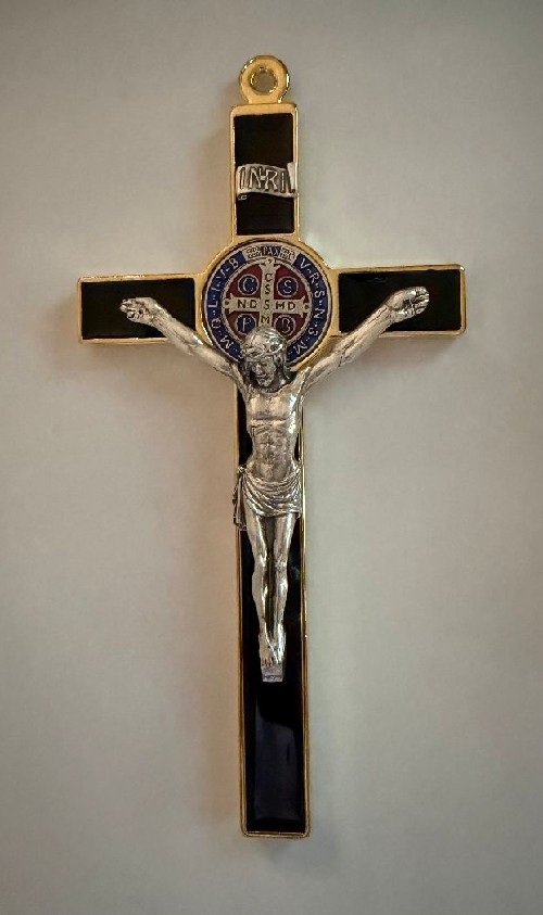 Crucifix Wall: 8' St. Benedict cross blk enamel/gold trim/color medal