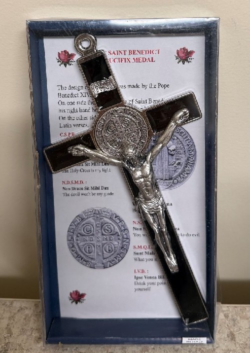 Black Enamel Crucifix With Silver Saint Benedict Medal  8 Inch