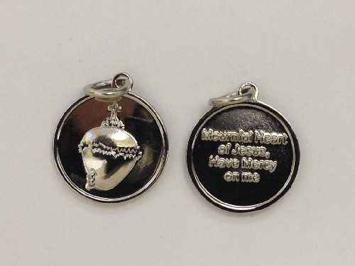Medal: Mournful Heart of Jesus Medal (Silvertone) with English/Spanish Insert Card.The front of the medal shows the image of the Mournful Heart of Jesus with an inscription on the back of the medal which reads "Mournful Heart of Jesus Have Mercy On Me" in English.