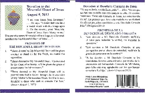 Jesus 8/9/2013: "...The one who wears this medal will not forget to offer small sacrifices to this Mournful Heart of Mine."PROMISES OF THE MOURNFUL HEART OF JESUS MEDAL (Jesus 8/1/13): 1."Those devoted to My Mournful Heart will be given courage to stand up for the Truth, no matter the opposition."2. "Those devoted to my Mournful Heart, if persecuted by the abuse of authority, will be given the grace of perseverance in righteousness."3. Those devoted to My Mournful Heart will be granted remarkable favors through the intercession of My Mother's Immaculate Heart, for She is most thankful to those who seek to console Her Son."