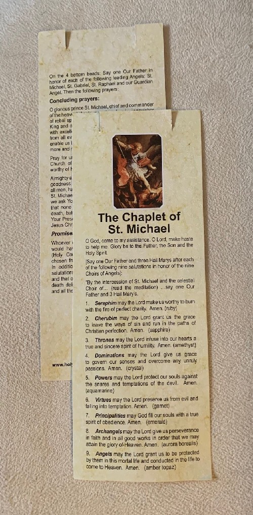 This beautiful crystal chaplet consists of nine groups of four beads each (three Hail Mary beads and one Our Father bead in each group). The nine groups are in honor of the nine choirs of angels. This chaplet was given to a devout servant of God, Antonia D'Astonac, in an apparation by St. Michael. It comes with instructions that explain how to recite the chaplet.