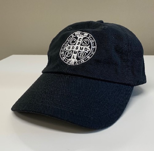 Hat: St Benedict Medal Ball Cap Navy Blue/White Embroidery: This hat features the powerful St Benedict medal in White embroidery on a Navy Blue ball cap. This medal is a popular sign of warding off evil spirits and is a reminder of God's and St Benedict's blessings and protection. Great for men or women. Clothing items are non-returnable.