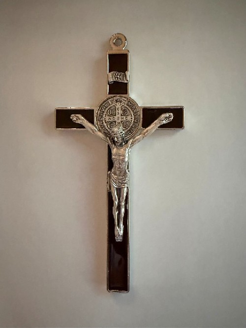 St. Benedict 8" Wall Crucifix - (Brown enamel/Silver Medal)